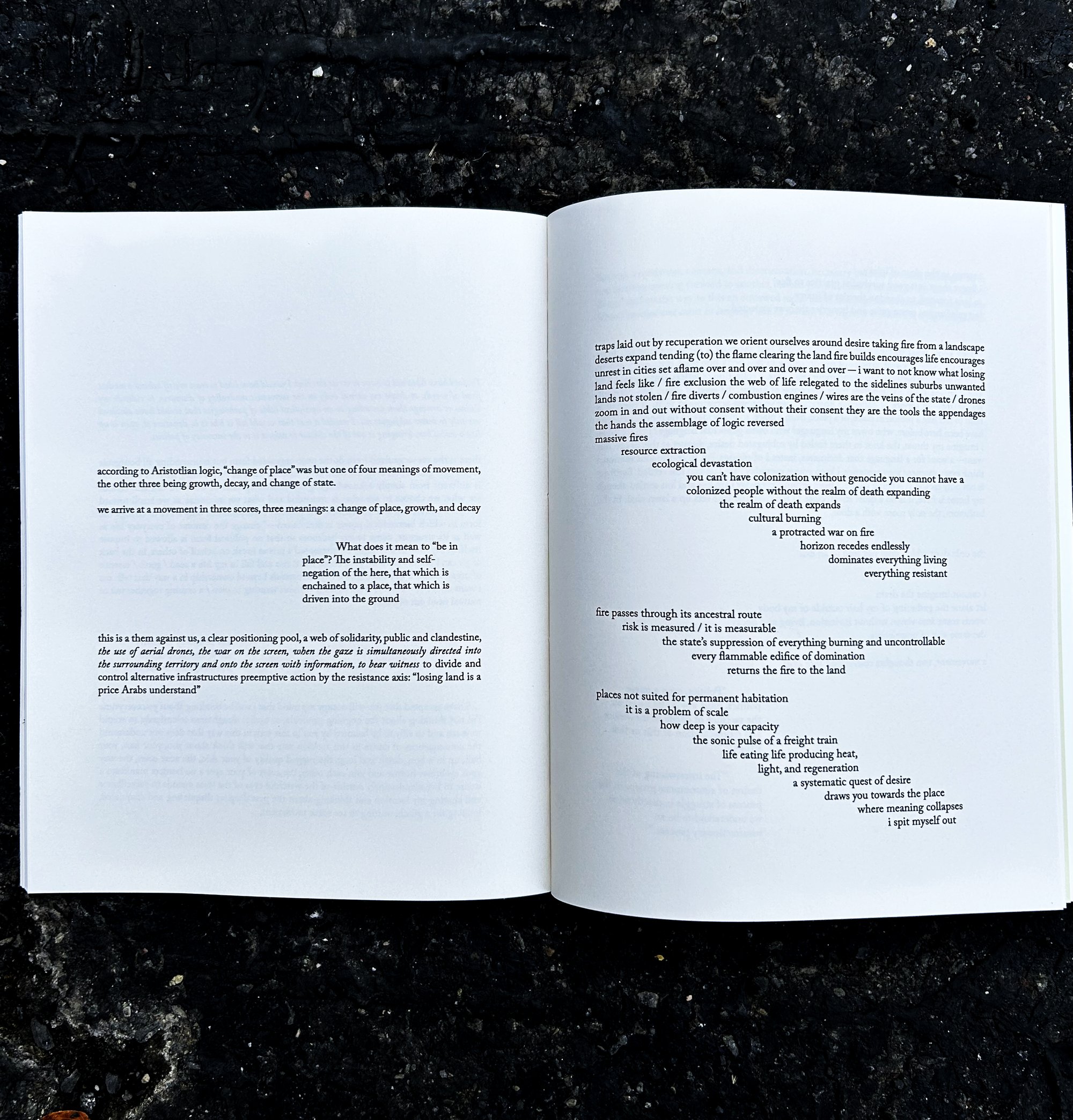 Intertextually poetic, Sahar Khraibani writes in conversation with other writers and philosophers to question, “who owns my language?” and “What does it mean to be in / place?" And yet, between bureaucracy and philosophy, there are moments of intimacy, friendship coexisting in the shared space of the poem—between speaker and addressee, the body and the living world—where belonging carries the weight of grief.