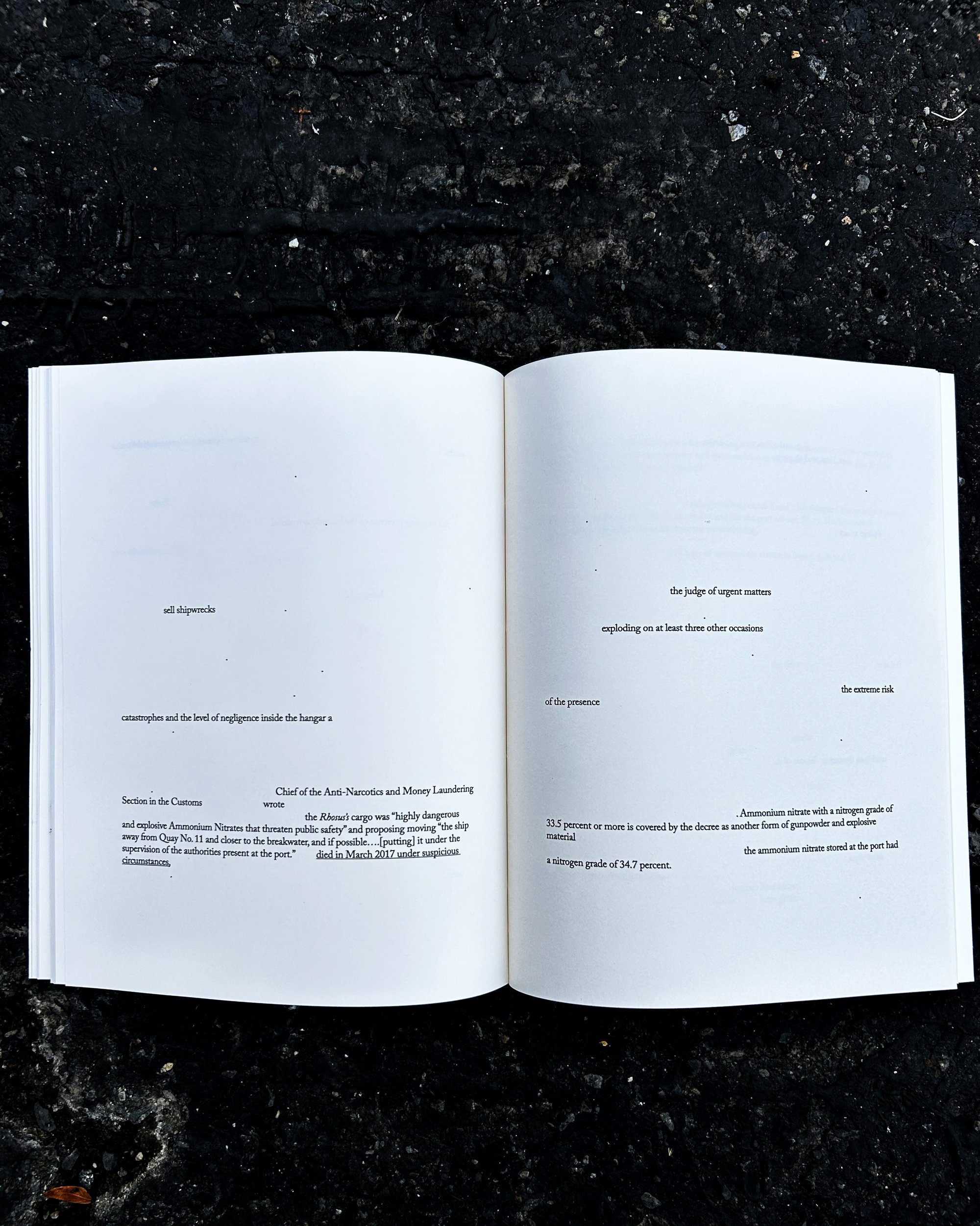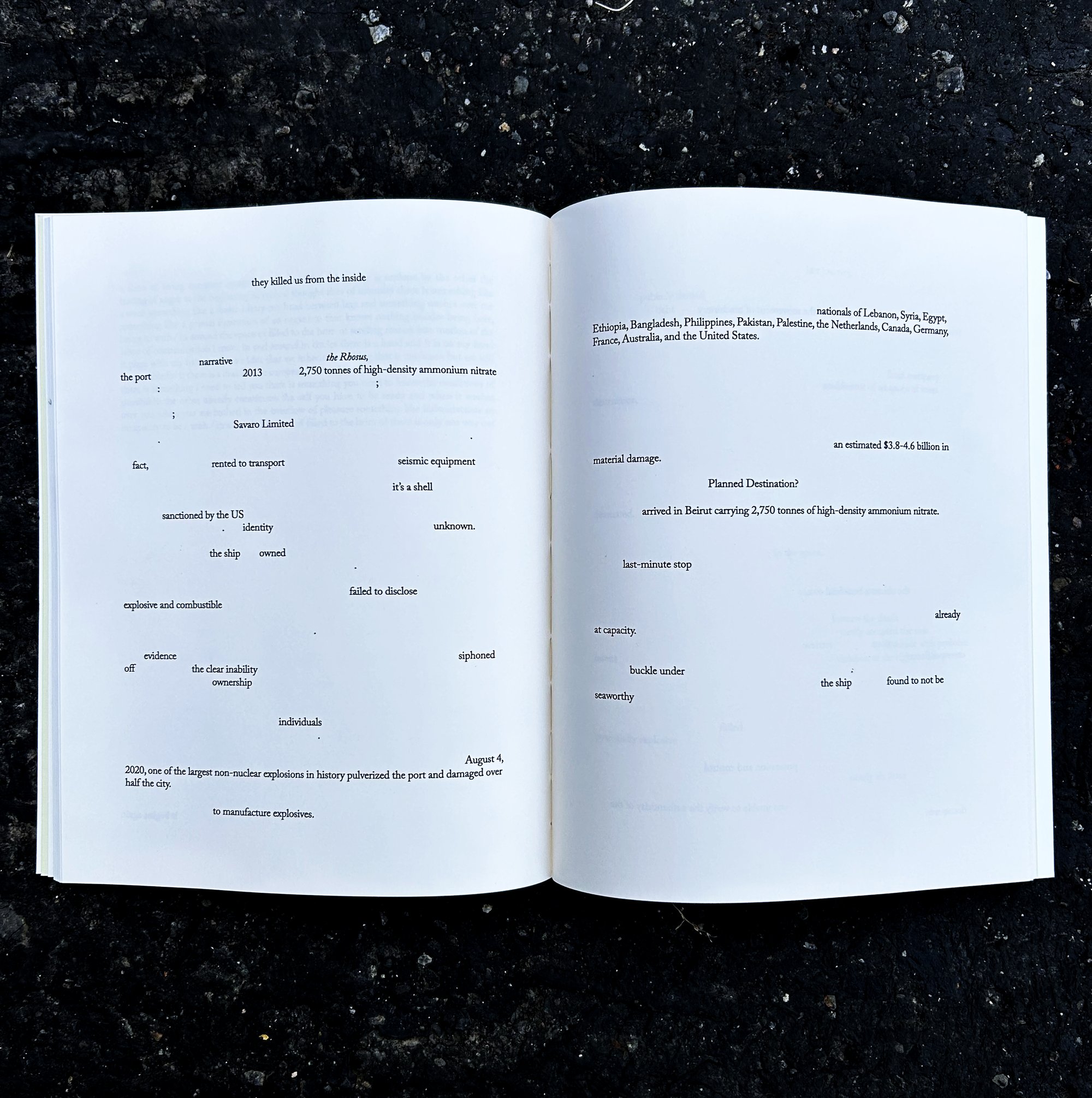 Written after the Beirut Port Explosion on August 4, 2020, when 2,750 tonnes of ammonium nitrate exploded in the commercial and residential port of Beirut after years of warning and mismanagement, Anatomy of a Refusal drifts between lineated and prose poetry, creating a transitional space of mourning. Comprised of three sections, “Mutually Assured Destruction” confronts displacement; “Blast” erases and rescribes bureaucratic documents written about the explosion, and “Deterrence” “return[s] to the place of injury.”